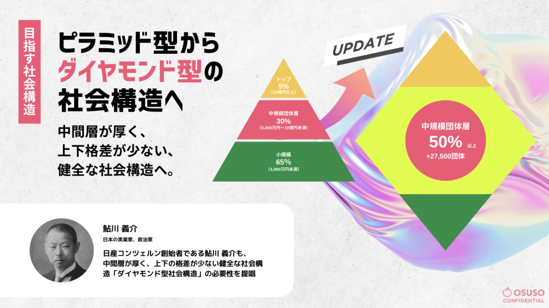 新田 僕はこれからの日本をダイヤモンド型の社会構造にしていきたいと考えています。日産の創業者である鮎川義介さんは「ダイヤモンド型社会構造」を提唱し、中間層が厚い社会こそ富が広く共有される健全な社会だと説いていました。