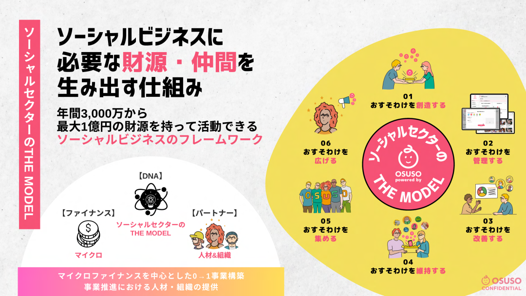 新田 僕らは、誰もが結果を出せる再現性の高いパッケージモデルをつくることによって、成功する社会起業を量産することを目指しています。事業の内容は違ってもやるべきことには共通点があります。共感を生み、財源と仲間を集め、それを広げていく。その流れを6段階にして「ソーシャルセクターのTHE MODEL」として整理しました(下画像)。このフレームワークが循環するようになると、社会起業家の事業基盤がどんどん強くなっていきます。