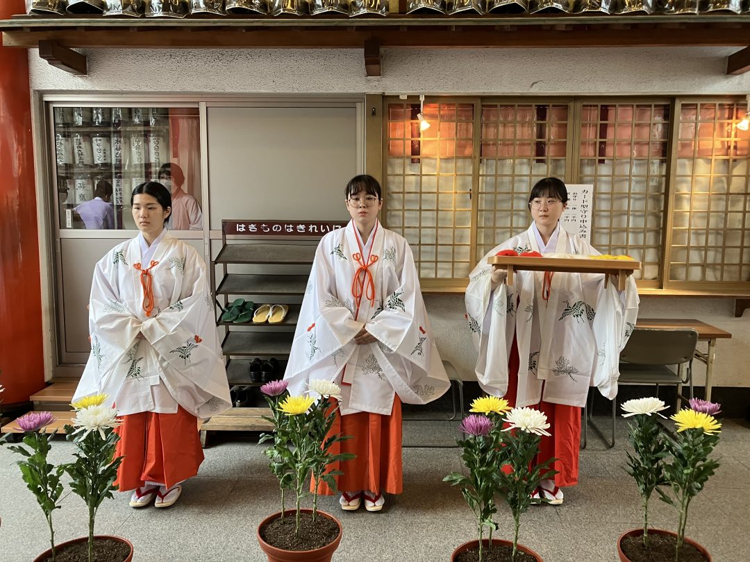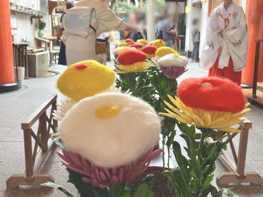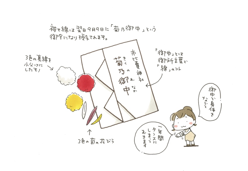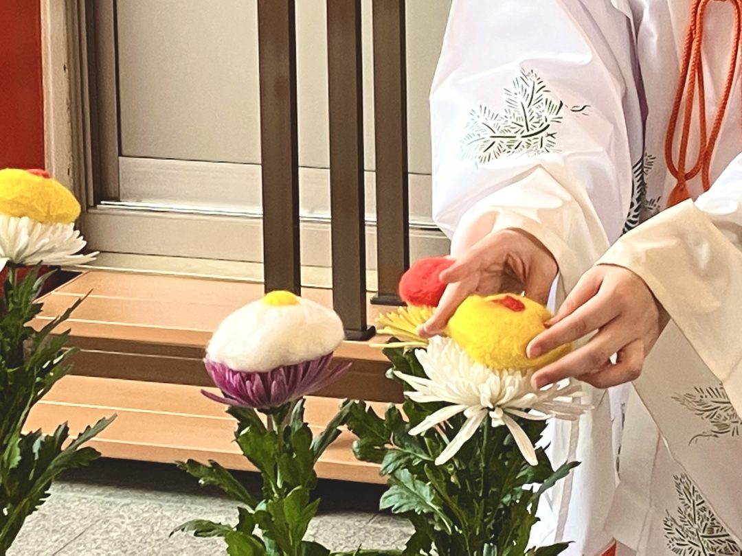 しばらくすると、社務所の中から神主さんと3人の巫女さんが粛々と現れた。ひとりの巫女さんが手にするお盆の上には赤・黄・白のふわふわとした丸い綿のようなモノが乗っている。神主さんの祝詞の後、2人の巫女さんが綿のようなモノを一つずつ菊の花の上にそっと乗せて行く。それを、ただただ、物音出さずに眺める私たち参拝客。この「菊の上に綿のようなモノを乗せる」という、一見何をしているか不明だが、実は重陽の節句のアンチエイジングに必要な美容具らしきモノを作る手順のひとつなのである。