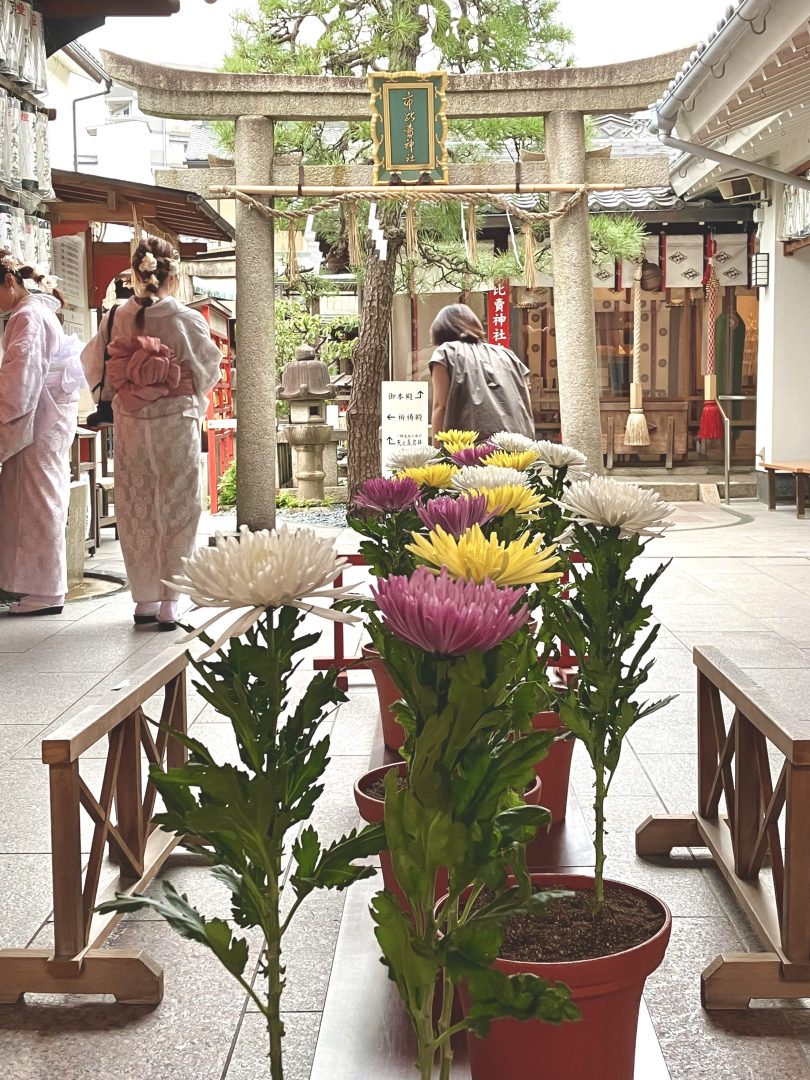 重陽の節句の前日9月8日の夕方、そのいちひめさんの小さな境内に鉢植えの菊の花がズラッと一列に並べられていた。赤・黄・白のちょっと大きめの菊の花。それらを少し遠めから眺めるように囲む参拝客十数名。もちろん、私もその中のひとりだ。