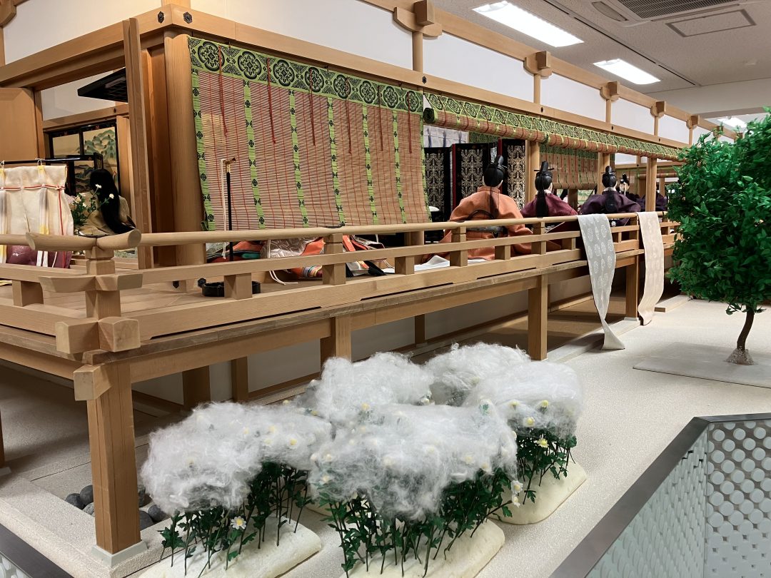 「宮中の位の高いお姫様たちは、この大きな菊と真綿を1本ずつもらえて、位が低い人たちは、小菊に白い真綿を全体的にワサッと被せたものを少しずつちぎって、それをもらってたそうなんよ」と。