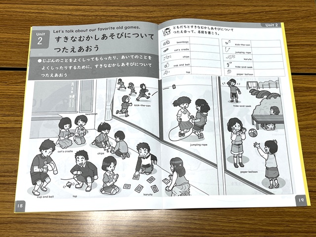 例えば低学年のテキストには「好きな昔遊びについて伝え合おう」という単元があります。子どもたちは生活科の「昔遊び」の授業で、地域の方を招いてお手玉やおはじきといった昔遊びを楽しむ体験をしており、「グローバル・スタディ」では「昔遊びを英語で言ってみよう」といった教科間の連携があります。授業では、例えば「I like ~」を使って、自分の好きな遊びを英語で伝える練習を行います。