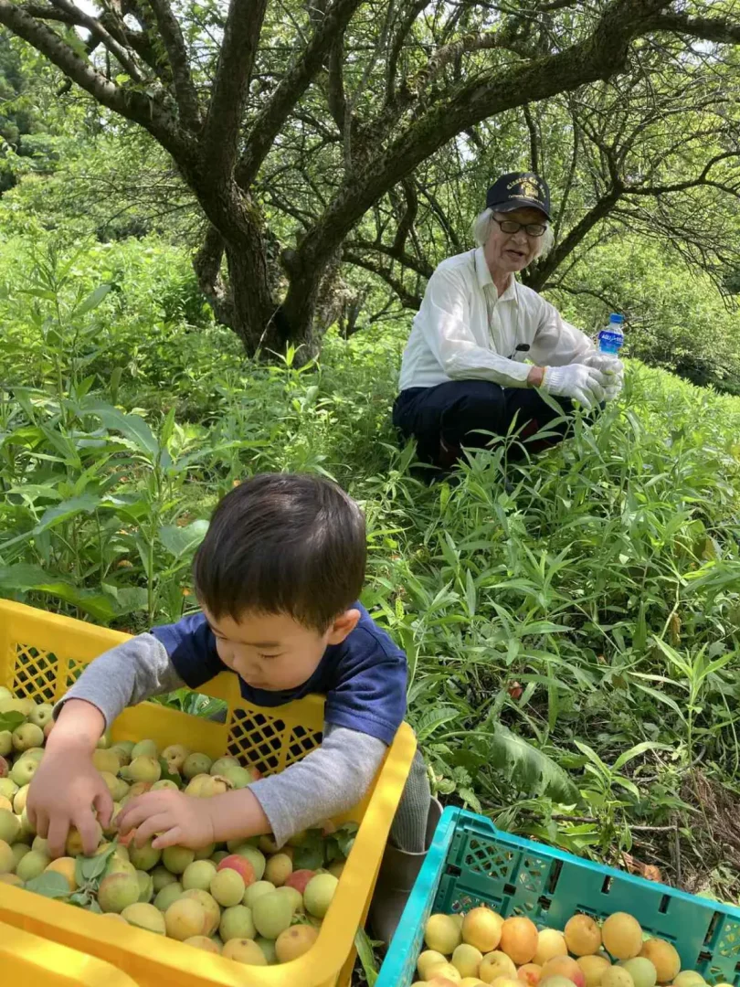 山本さんの息子さんも近所のジイちゃんと仲良し。この日は梅の実の収穫のお手伝い。(写真提供:のと復耕ラボ)