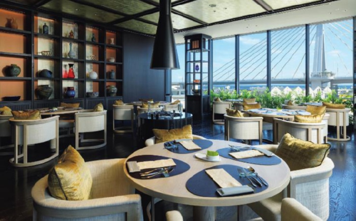 ガストロノミーのテーマは「循環と再生」。上写真手前の前菜は、通常は廃棄されるりんごの芯を発酵させて発酵ウォーターを仕立て、ガストロバック(減圧加熱調理器)でヒラメに香味ごと封じ込めた。この一皿は、7月に青森で開催された全国知事会において高い評価を得た。コース料理のパンを頬張ると、驚くほどに風味豊かで軽やかだ。聞けば、「三内丸山遺跡から発見された酵母を使っています」と、シェフ。悠久の縄文文化の息吹が、現代の食卓に息づいている。歴史のロマンと健康志向が一体となった体験に、心身がゆっくりとほどけていく。