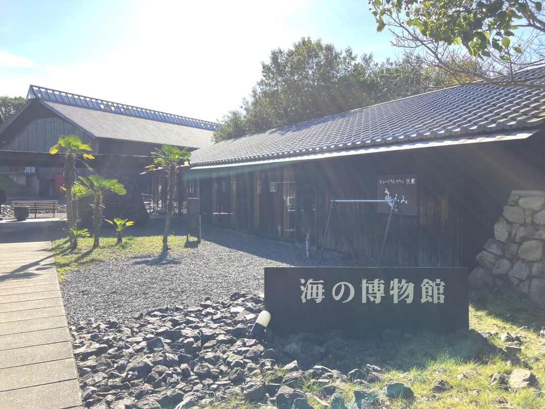 海の博物館のエントランス。右側の建物は併設のカフェ。太くてものすごくやわらかい伊勢うどんのアカモク入りなどが食べられる