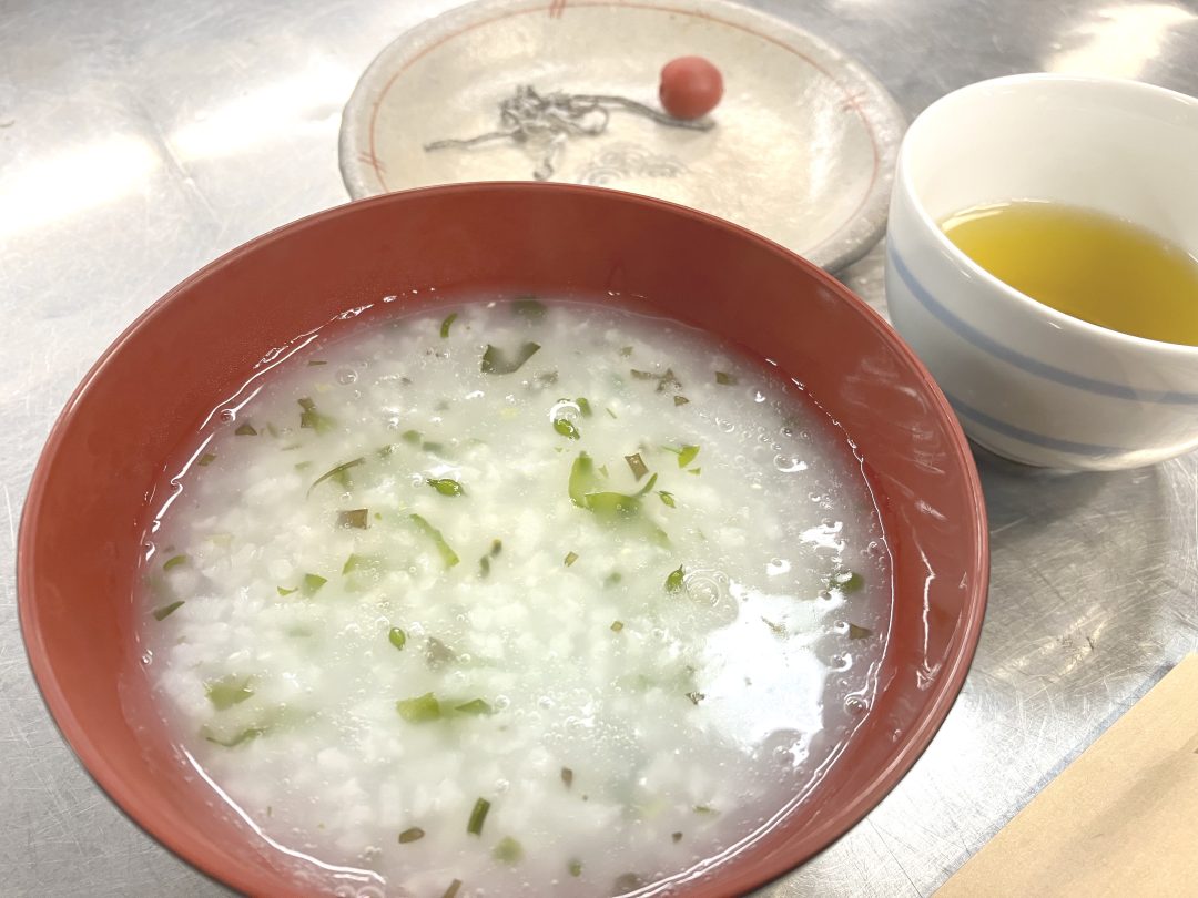 しばらくすると、刻まれた海の七草を入れた七草粥が手元に運ばれて来た。白いお粥に緑の具材。見ためは陸の七草粥に近しい。ひとすくい、口に入れてみる。陸の七草よりも細かく刻まれているからか、海藻の存在感はそんなにアピールして来ない。あっさりしていて、なんなら陸の七草粥よりもスルスル〜っと喉を通りすぎていき、身体にますます優しい感じがする。