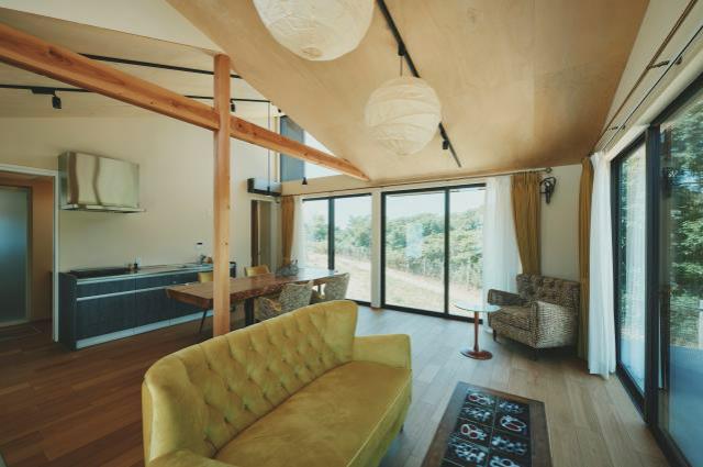 大きな開閉式の扉を開けると、内と外の境界が消え、風や光が自由に流れ込む。稲わらで覆われた屋根は、淡路島の四季と一体となり、目に映る景色と手触りが自然そのものになる。ここでは時間の感覚もゆっくりと流れ、日常を忘れて自然と調和する心地よさを味わえる。